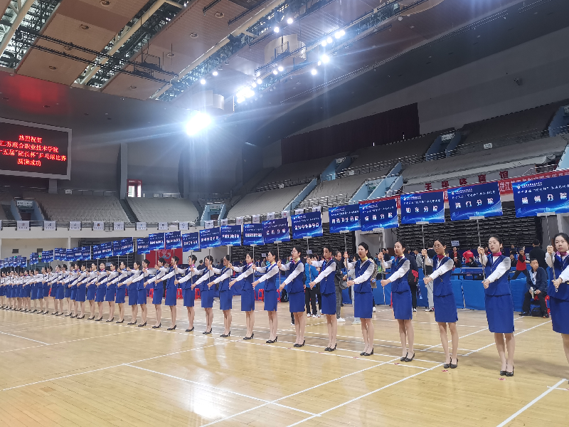 船舶工程学院空中乘务、航空服务专业的学生身着蓝色制服,在赛场入口指引参赛队员入场、在开幕式现场举起手举牌为参赛队伍定位、在道路旁为参赛人员引路,成为乒乓球赛场的蓝色风景线。