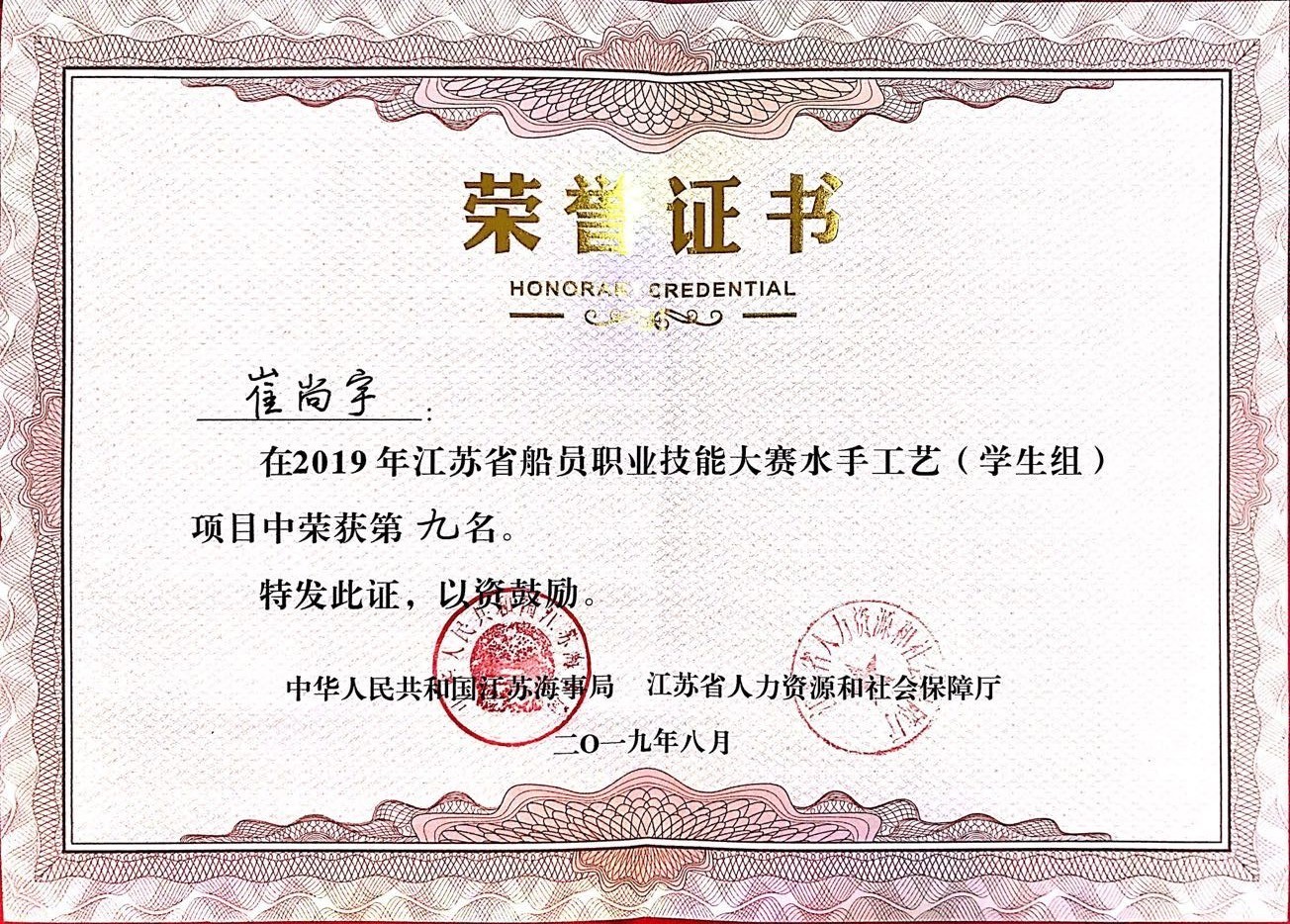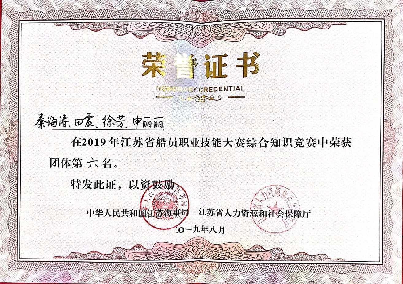 本次大赛由江苏海事局、江苏省人力资源和社会保障厅联合举办,被列为“江苏省百万技能人才技能竞赛岗位练兵活动”省级一类赛事来自全省航运企业、船员劳务派遣公司、航海院校的422名选手同台竞技,展开了激烈角逐。我校学生崔尚宇获得水手工艺比赛(学生组)第九名;由秦海涛、田震、徐芳和申丽丽组成的团体获综合知识竞赛第六名;学校荣获优秀组织奖。