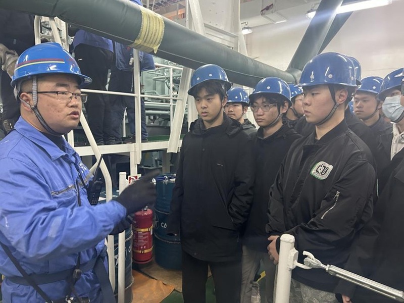 在企业专家的带领下,我校师生首先参观了厂区船坞、船台及各个车间,直观学习到了各个船舶分段,并了解了目前企业主要在建船型,使学生深刻学习到了造船流程。随后,学生们登上了一艘5万吨成品油船,分别参观了机舱、甲板、驾驶台等区域。企业专家非常细致地给学生讲解了主机、发电机、锅炉、制冷装置、轴系等重要的机舱设备,并介绍了部分技术非常先进的新设备,让学生学习到了很多在课堂中难以获取的新知识,拓宽了专业知识面。最后,企业专家为我校师生介绍了扬子江集团的企业文化、已建造的典型船舶、企业发展愿景等。企业也非常热情地表示,后续会进一步加强和我校的合作,共育高素质船业人才。