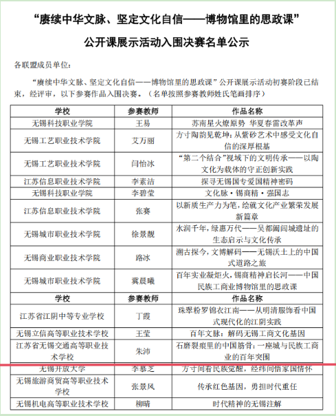 近日,马克思主义学院组织教师参加了无锡市教育局等三部门开展的“赓续中华文脉、坚定文化自信——博物馆里的思政课”公开课展示活动。5月20日,官方公示了初赛结果,朱沛老师的作品《石磨裂痕里的中国筋骨:一座城与民族工商业的百年突围》入围决赛。