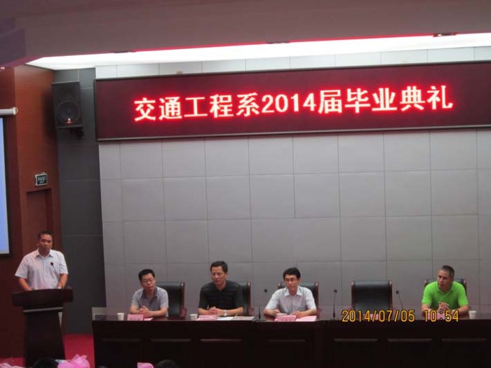 2014年7月5日上午,交通工程系2014届毕业生毕业典礼在我校学术报告厅隆重举行,出席本次毕业典礼的有学校校长陆春其老师、教务处副处长邢木清老师、学生工作处副处长王演新老师、交通工程系主任陈建明老师、副主任邹定南老师以及交通工程系全体教师和系部2014届全体毕业生。