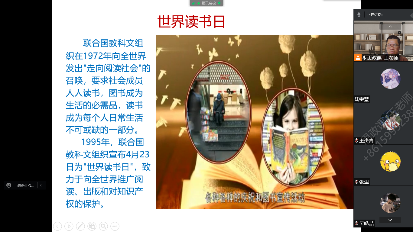 最后,王老师在线上社团成员一起交流了读书的方法与心得,并且希望社团成员们能够趁年轻时多读书、读好书,养成爱读书的好习惯,不仅在“世界读书日”要读书,而且应该把读书的好习惯融入到生活中的每一天!