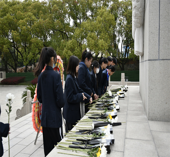 魂魄托日月,肝胆映河山。师生们怀着崇敬的心情来到无锡市革命烈士陵园,走过百米甬道,在“为国牺牲人民英雄纪念塔”前的金山石广场列队肃立,向纪念塔敬献花圈,向英烈致以最深切的缅怀和最崇高的敬意。随后,全体默哀,向千千万万为国捐躯的英雄儿女表示深切哀悼。庄严肃穆的仪式寄托着延绵不绝的哀思之情,也昭示着慨然前行的奋发之志。