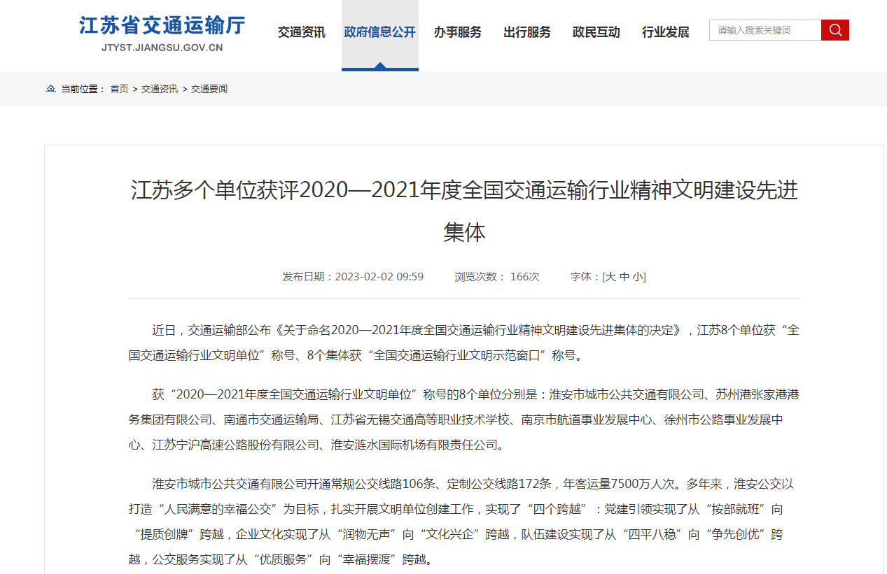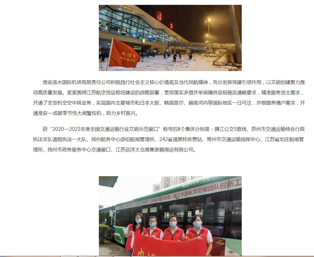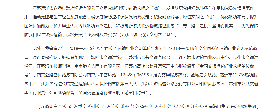 江苏省交通运输厅:江苏多个单位获评2020—2021年度全国交通运输行业精神文明建设先进集体