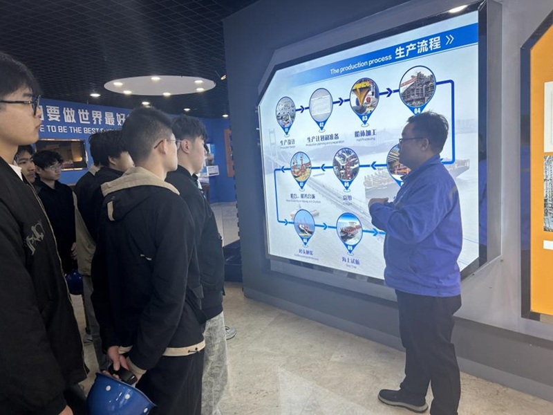在企业专家的带领下,我校师生首先参观了厂区船坞、船台及各个车间,直观学习到了各个船舶分段,并了解目前企业主要在建船型,使学生深刻学习到了造船流程。随后,学生们登上了一艘5万吨成品油船,参观了机舱、甲板、驾驶台等区域。企业专家非常细致地给学生讲解了主机、发电机、锅炉、制冷装置、轴系等重要的机舱设备,并介绍了部分技术非常先进的新设备,让学生学习到了很多在课堂中难以获取的新知识,拓宽了专业知识面。最后,企业专家为我校师生介绍了扬子江集团的企业文化、已建造的典型船舶、企业发展愿景等。企业方表示,后续将进一步加强和我校的合作,共育高素质船业人才。