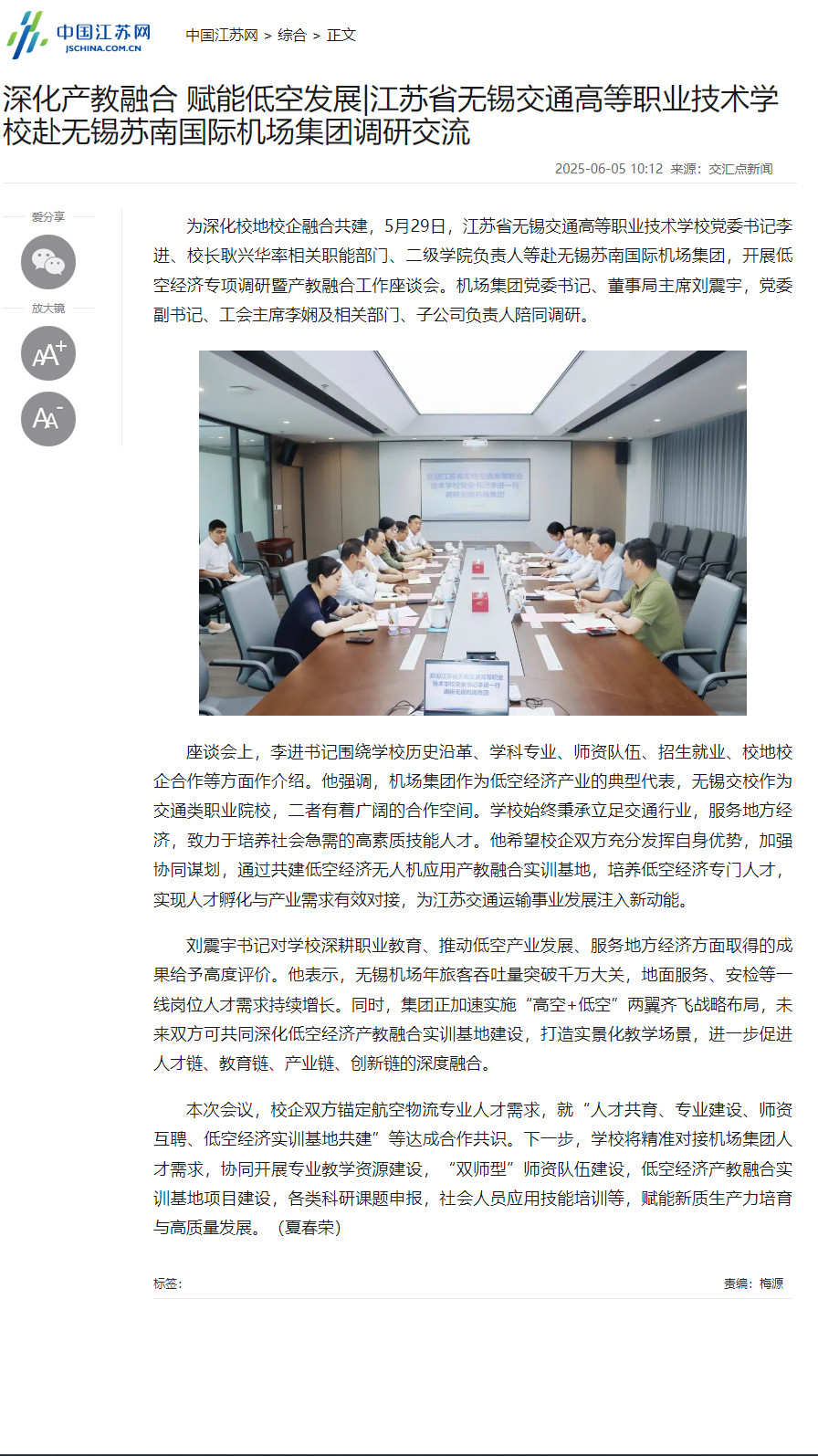 中江网:深化产教融合 赋能低空发展|开云手机客户端赴无锡苏南国际机场集团调研交流