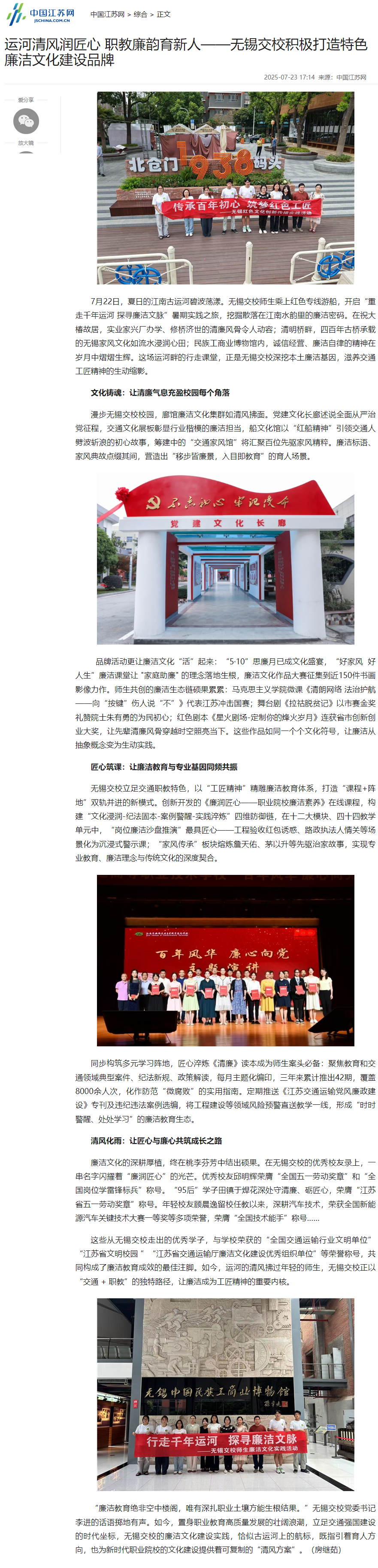中江网:运河清风润匠心 职教廉韵育新人——无锡交校积极打造特色廉洁文化建设品牌