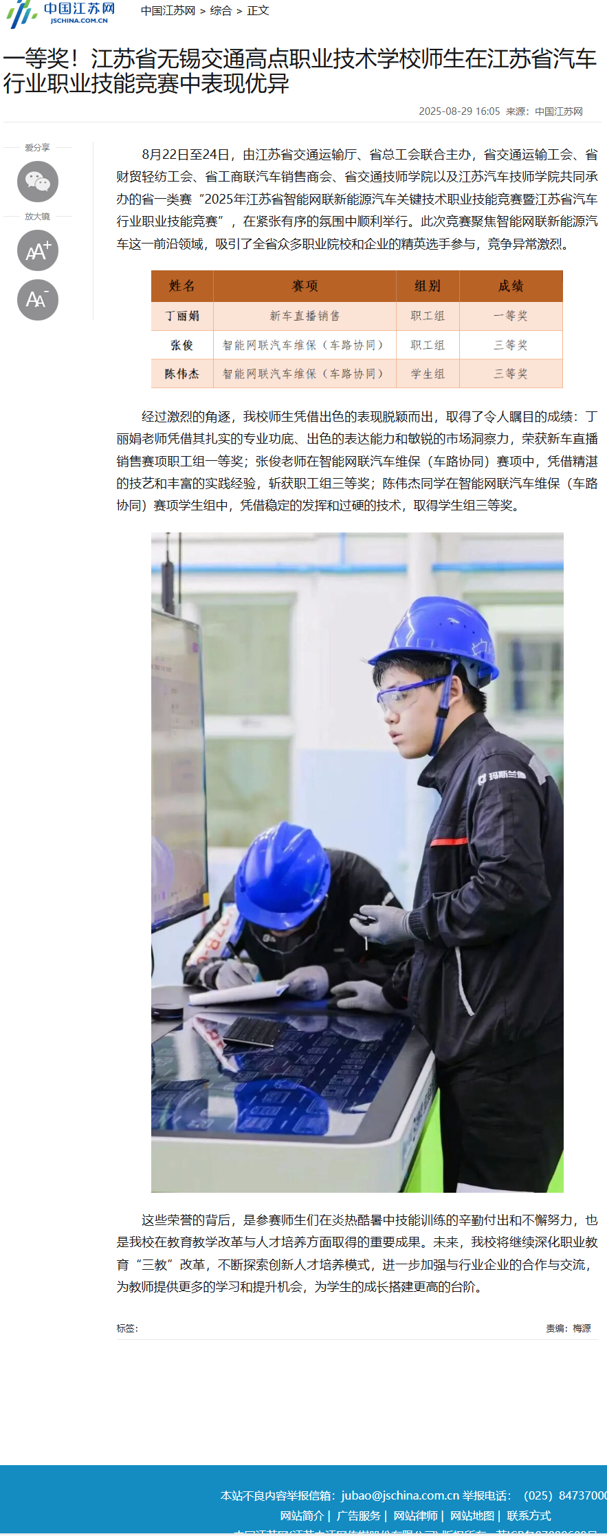 一等奖!江苏省无锡交通高点职业技术学校师生在江苏省汽车行业职业技能竞赛中表现优异_中国江苏网