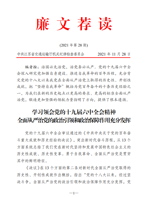 2021年廉文荐读第28期——学习领会党的十九届六中全会精神