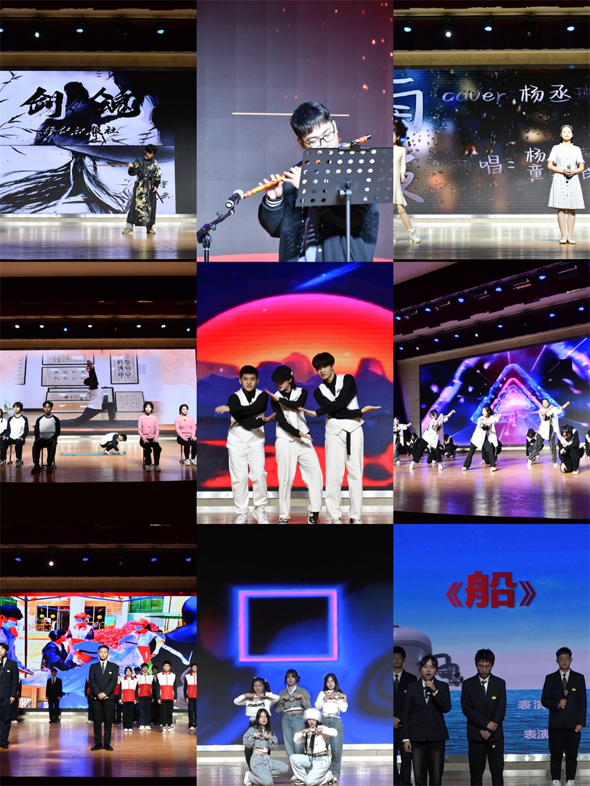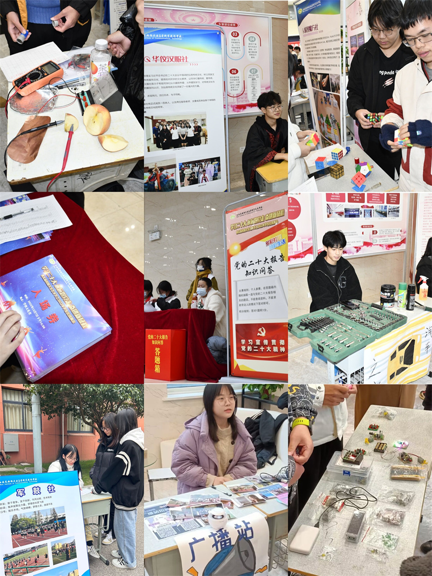 本次社团展示分为舞台展示、展位展示、体育竞技、党的二十大报告问答和趣味游戏等不同环节,活动动静结合,精彩纷呈。展位展示区域,各个社团独具特色的社团风貌、精心准备的限量礼物、精彩不断的技能展示、妙趣横生的趣味游戏、制作精美的手工作品,向同学们展示了各自社团的独特魅力,极具特色的展示内容也吸引了大批的学生,前来观展与互动的学生络绎不绝。舞台展示以歌曲、舞蹈、器乐、快板、朗诵、配音等节目形式,充分体现了社团活动成果。社团同学们热情洋溢秀出十八般武艺,他们在舞台上闪闪发光,光影交叠,脚步闪动,衣袖飞舞,足尖轻点于音符,身姿跟随于旋律。他们用热情的笑容,青春的活力感染了现场的所有人,一个个精彩节目,赢得了观众一次次热烈的掌声,现场的氛围也被一次次推向高潮。运动场上校园三人篮球赛,羽毛球比赛如火如荼地开展,同学们在赛场上挥洒汗水,点燃激情,沸腾青春,充分展现出蓬勃朝气和竞技热情。