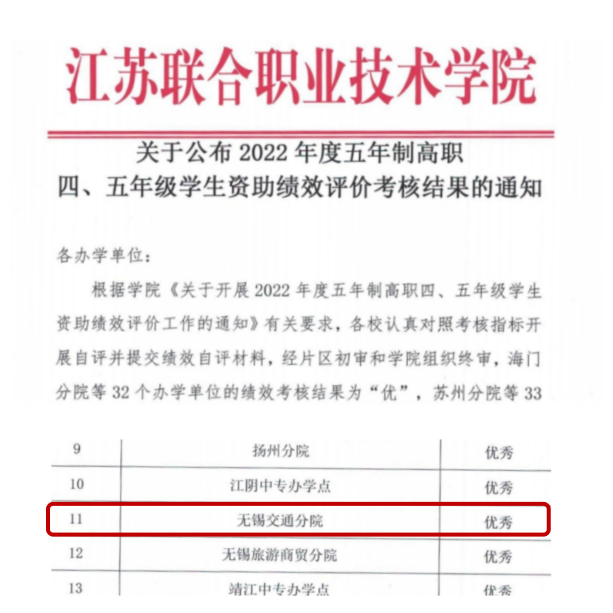 近日,江苏联合职业技术学院公布了2022年度五年制高职四、五年级学生资助绩效考核结果,学校获评“优秀”等级。